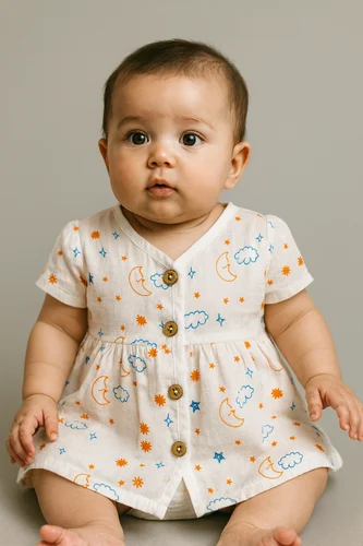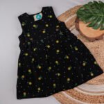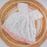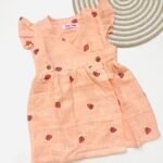 Peach strawberry print frock - adorable muslin frock cute strawberry embroidery soft puff sleeves and wooden button details for your baby's everyday comfort and charm.
