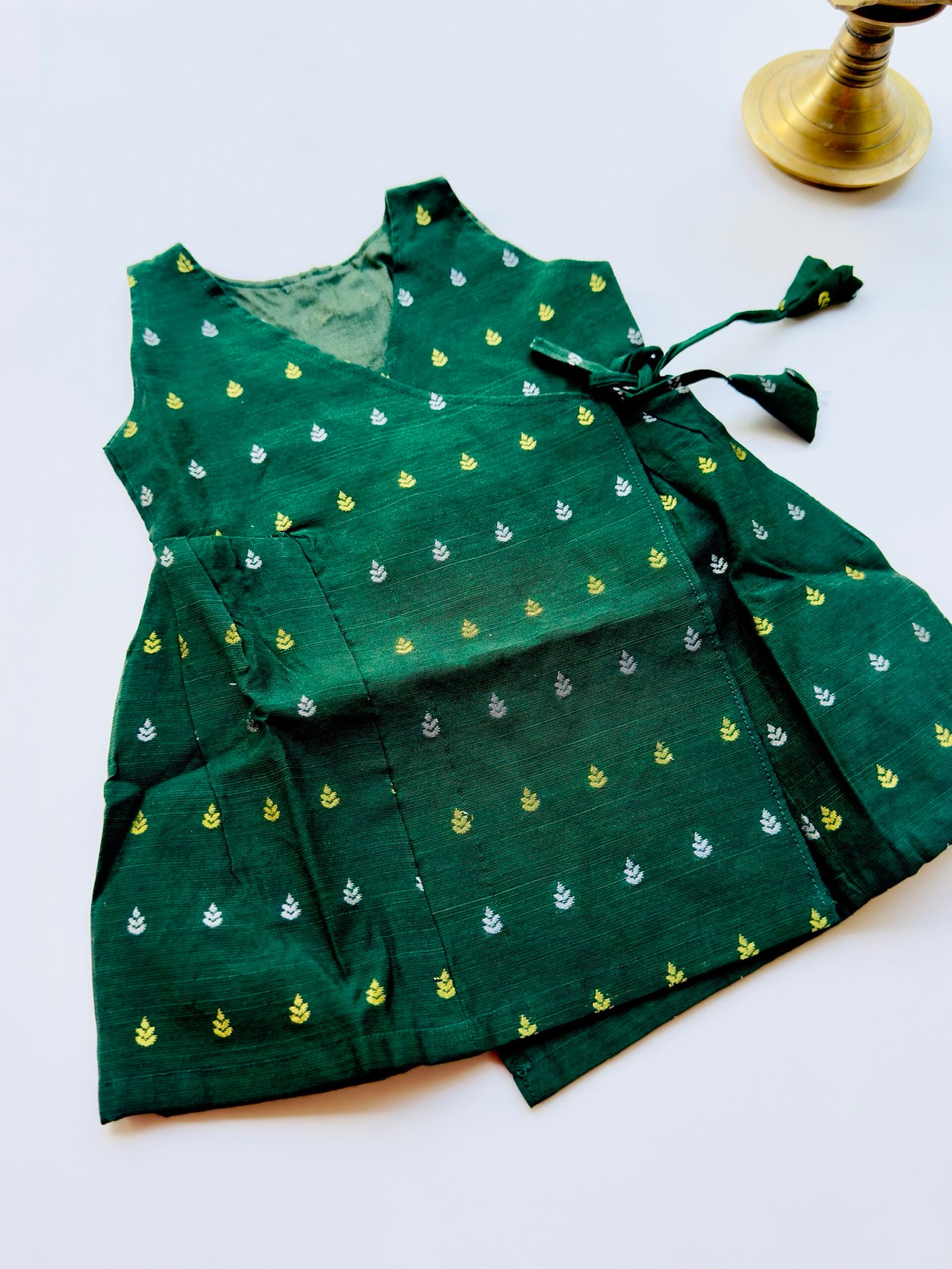 Celebrate your little one’s special moments with our vibrant green silk baby frock, designed with elegant gold woven polka dots,perfect for traditional ceremonies, weddings, and festive gatherings