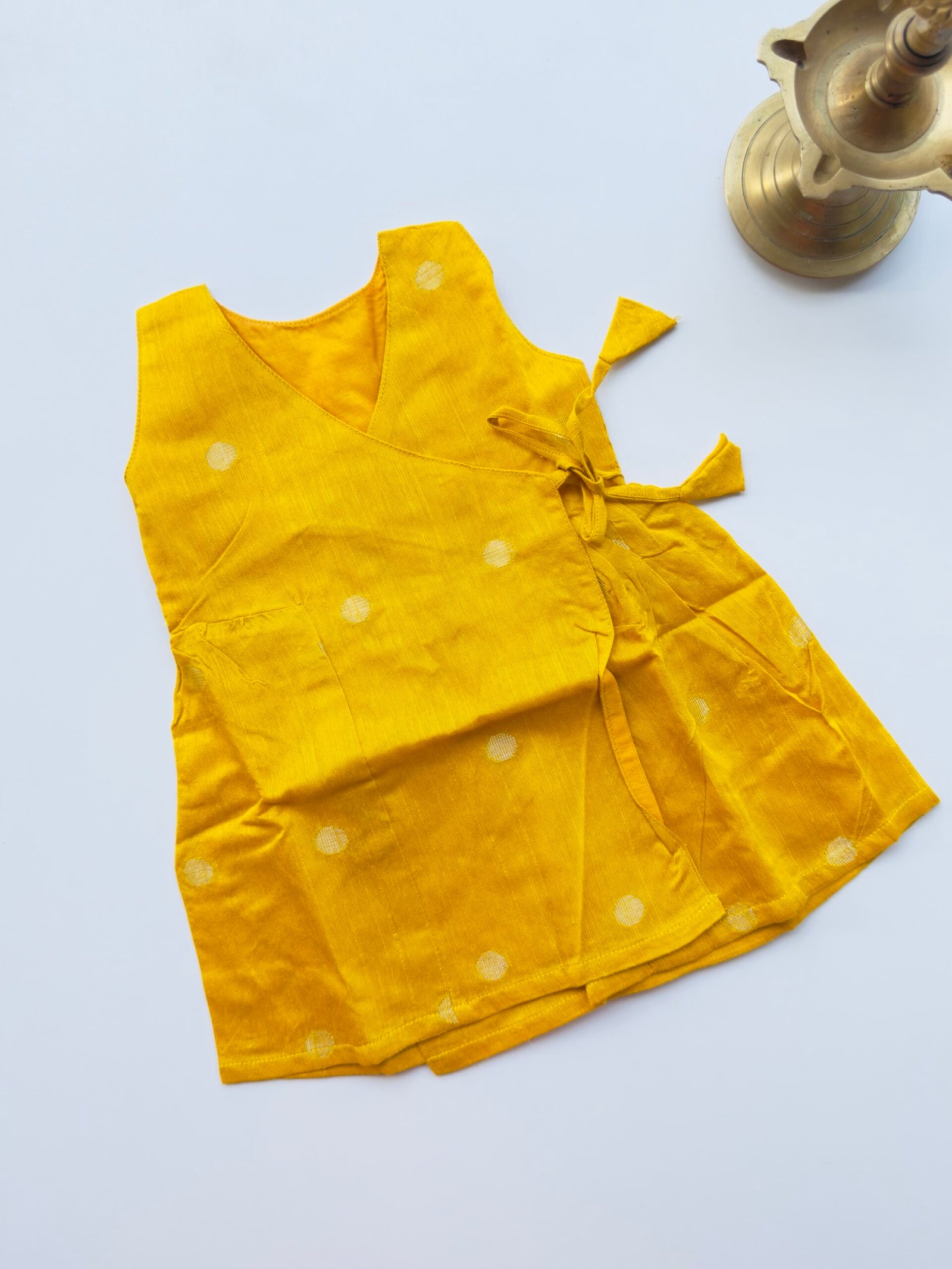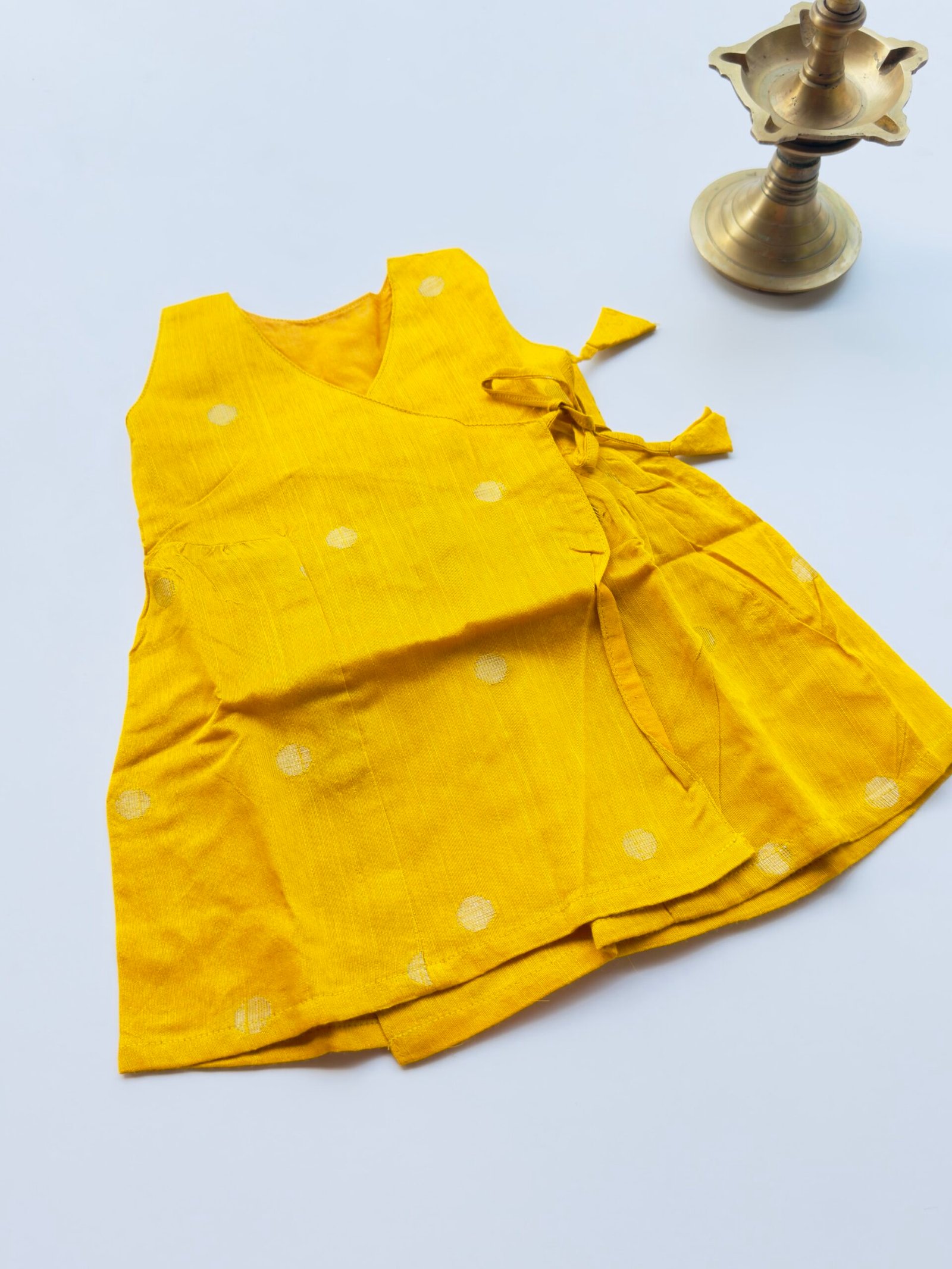 Be the first to review “Mustard Yellow Silk Baby Frock with Gold Polka | Side Knot Ethnic Wear”