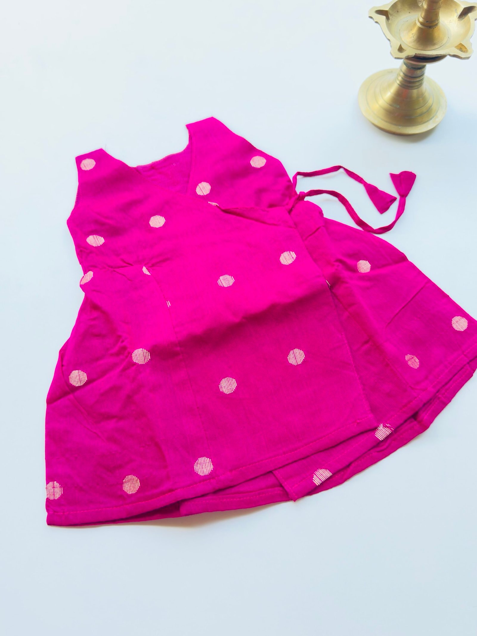 Celebrate your little one’s special moments with our vibrant pink silk baby frock, designed with elegant gold woven polka dots,perfect for traditional ceremonies, weddings, and festive gatherings