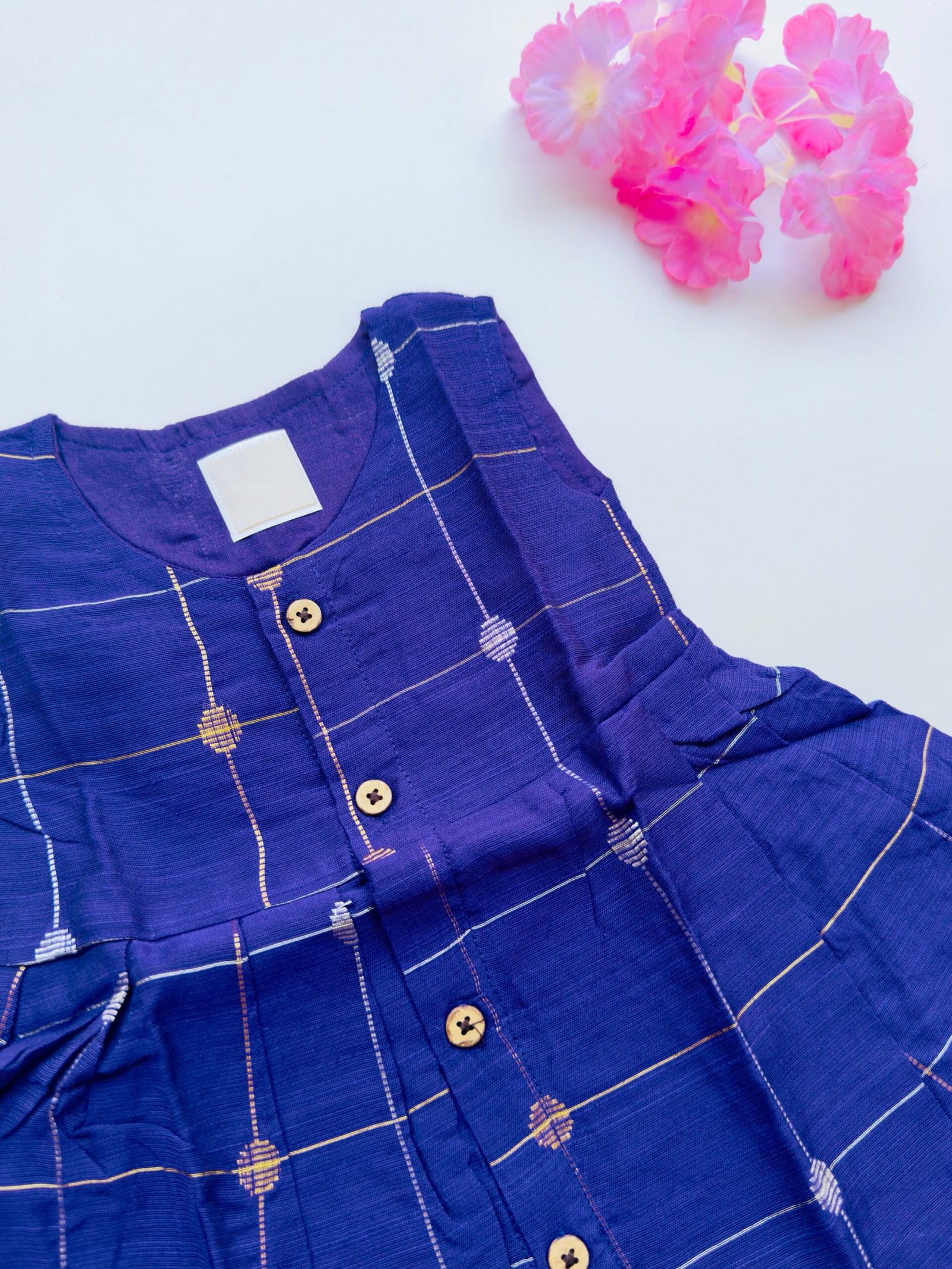 Let your little princess shine in traditional elegance with our Blue Ethnic Butta Sleeveless Silk Baby Frock, crafted from premium-quality silk for a rich, festive look. The deep purple shade paired with delicate gold and silver butta motifs gives this frock a regal South Indian touch — perfect for family functions, temple visits, or festive celebrations.