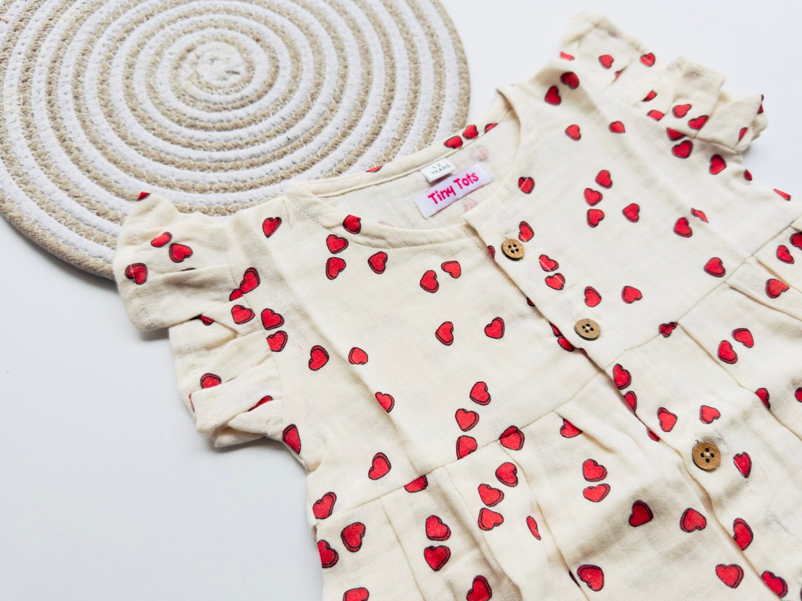 The adorable all-over red heart print adds a playful charm, while the front wooden button closure ensures quick and fuss-free dressing. Soft ruffle sleeves and gentle gathers at the waist create a relaxed, airy silhouette that allows your little one to move freely and stay comfortable.