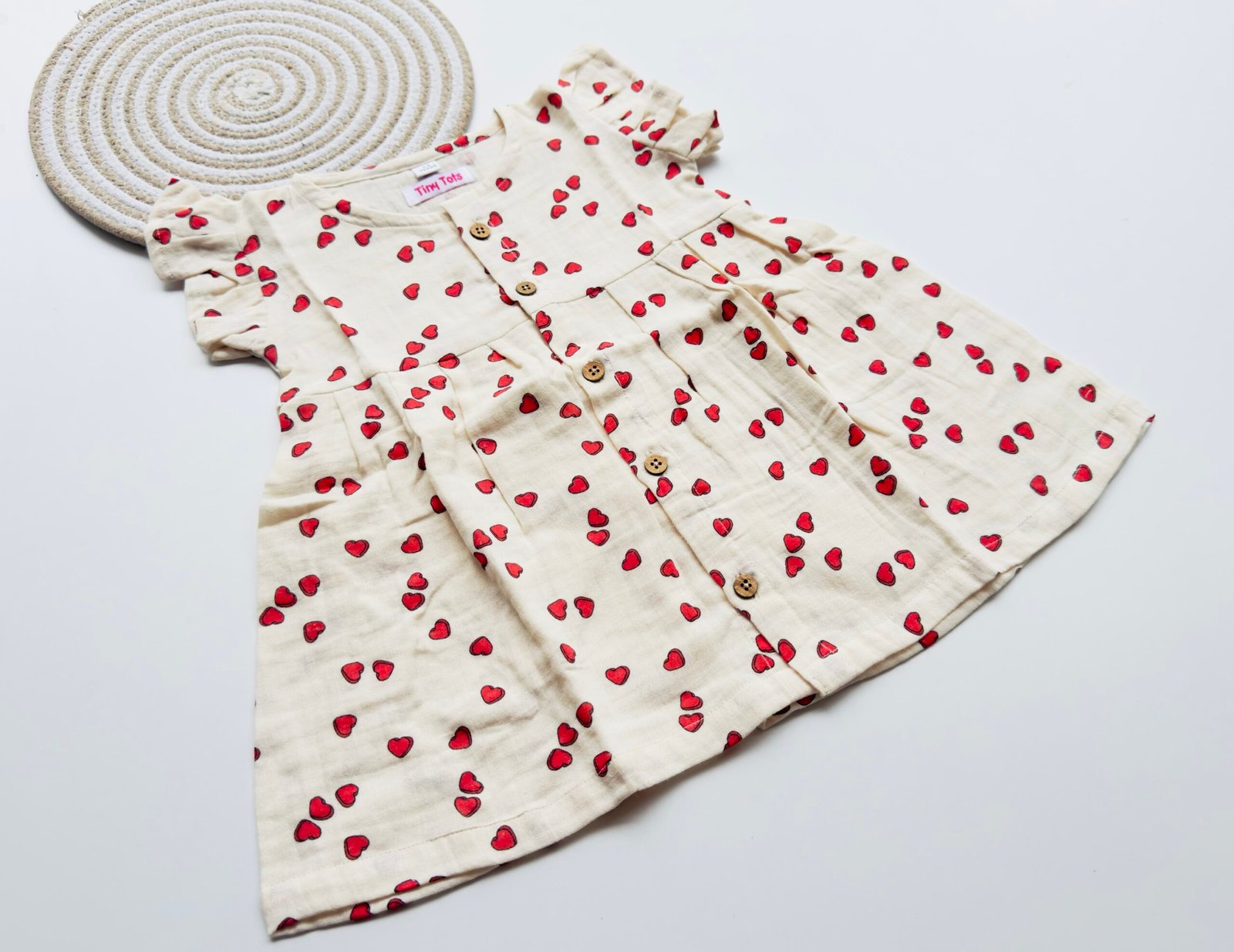 Adorable crinkle muslin frock crafted in ultra-soft cotton with a charming red heart print. Lightweight, breathable, and perfect for everyday comfort and special moments alike.