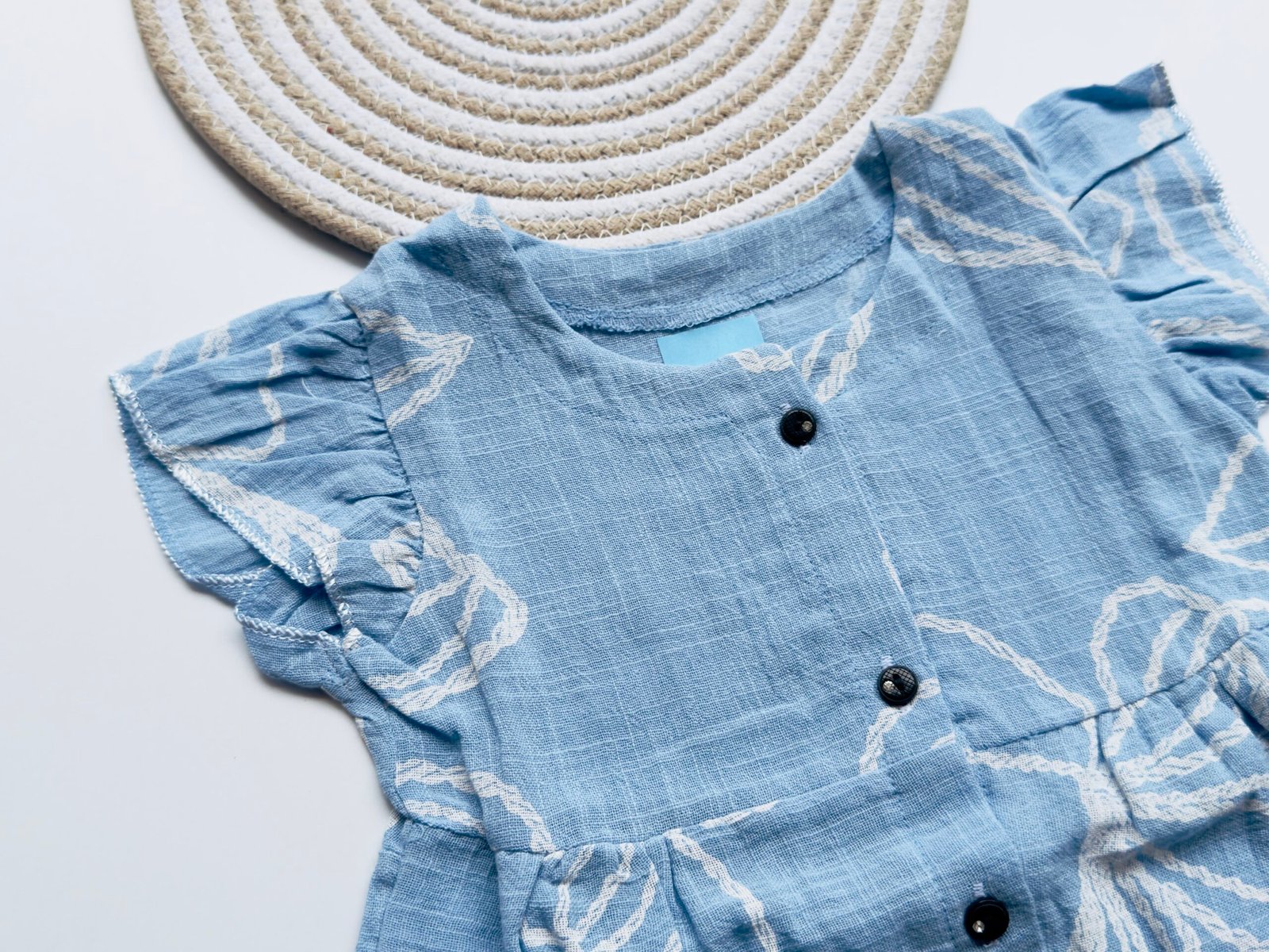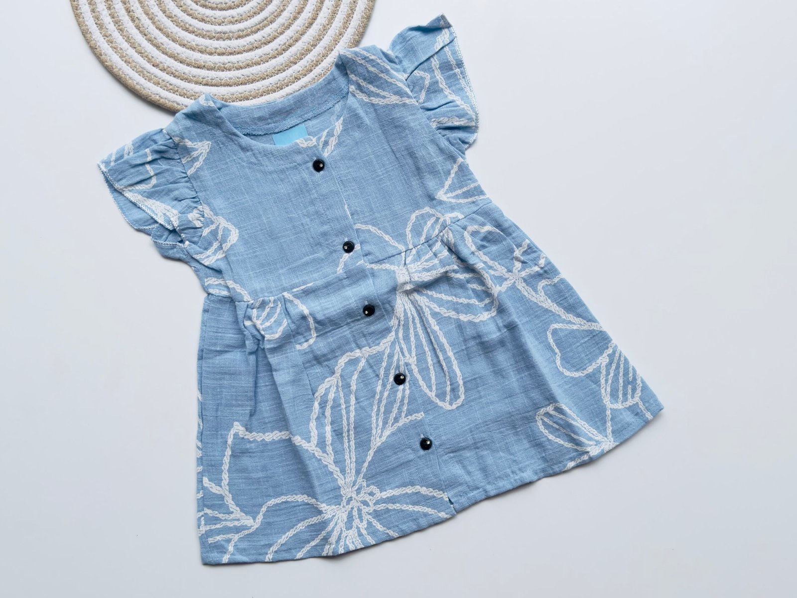 Soft and breathable sky blue muslin frock with a delicate white floral print and flutter sleeves for a fresh, stylish look.