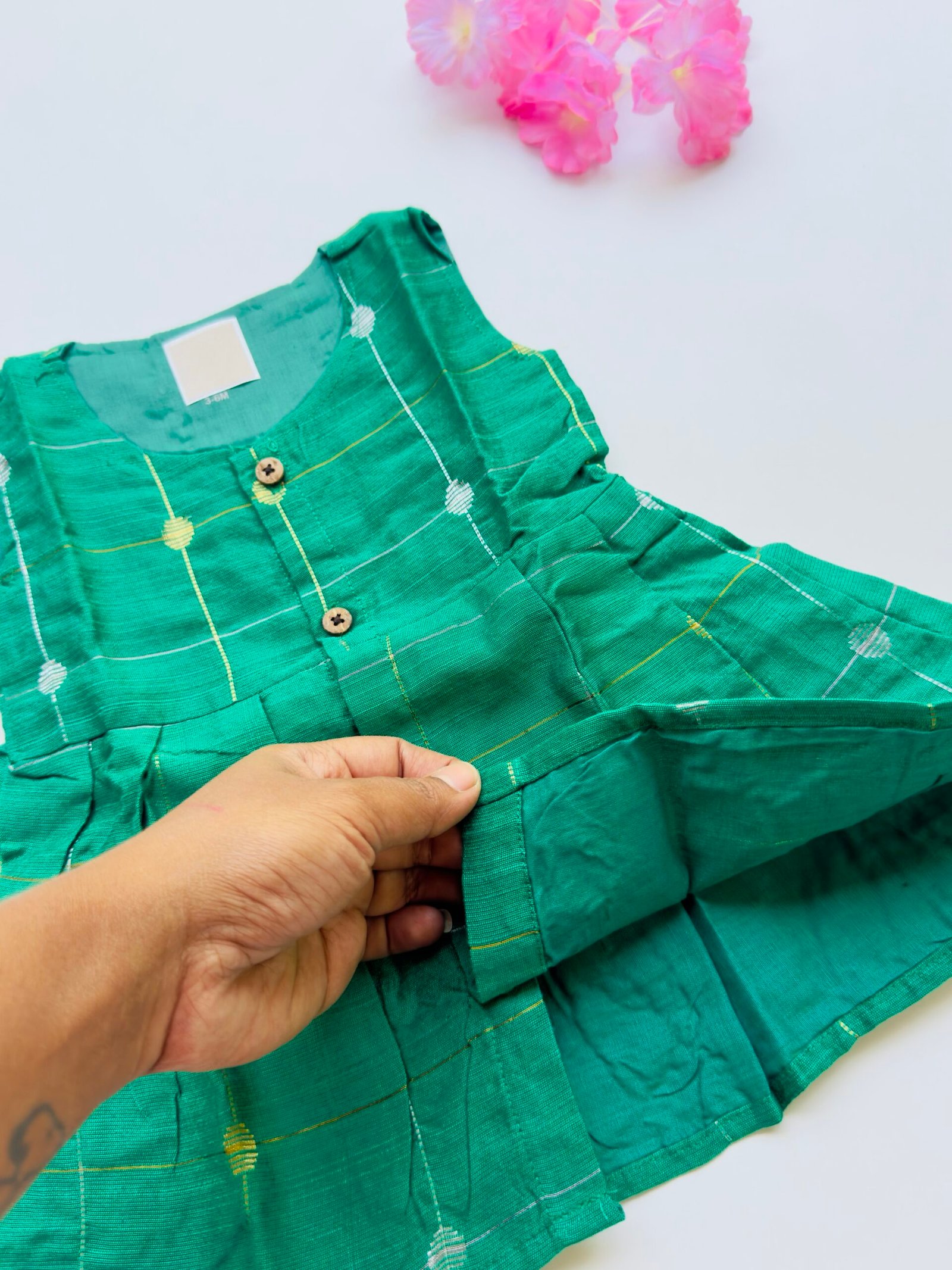 Green Ethnic Butta Sleeveless Silk Baby Frock With Wooden Buttons