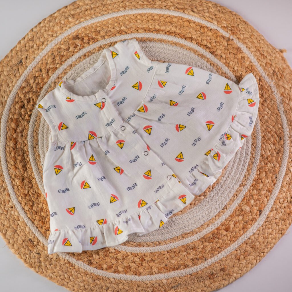 White with red heart print frock – adorable muslin frock cute strawberry embroidery soft puff sleeves and wooden button details for your baby’s everyday comfort and charm.