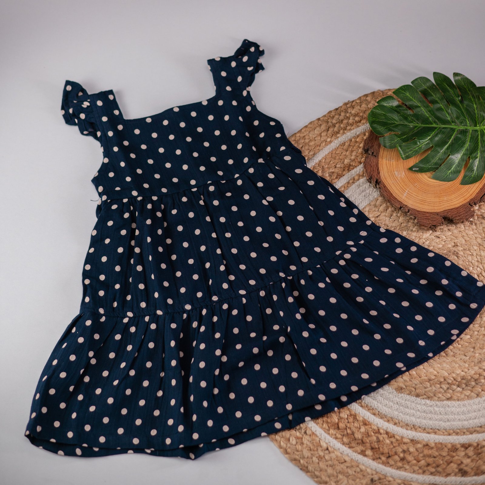 The rich navy blue base with delicate white polka dots makes it a versatile choice — ideal for family outings, playdates, or special occasions.