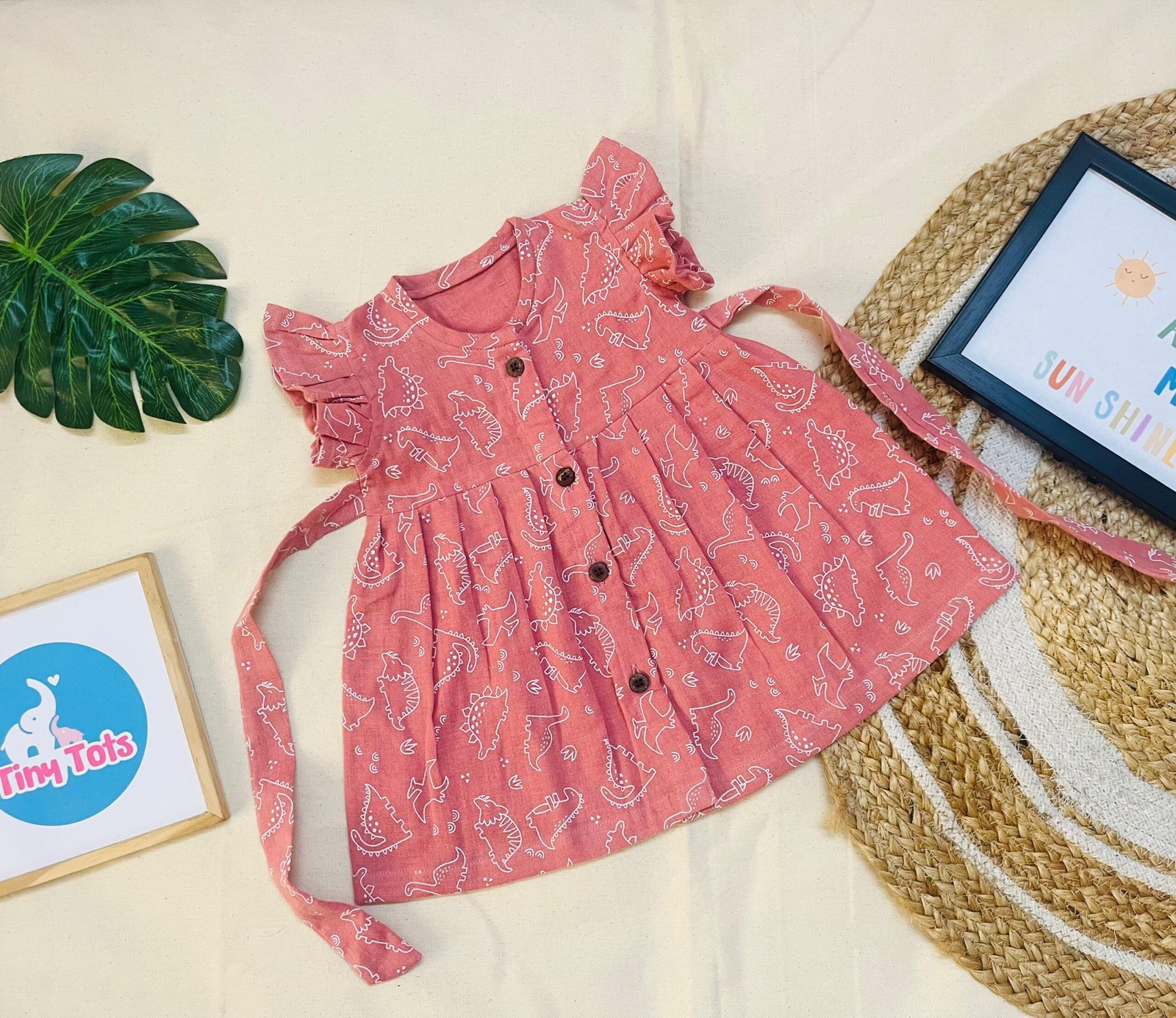 Pink Dino Muslin Baby Frock with Wooden Buttons – Soft & Stylish