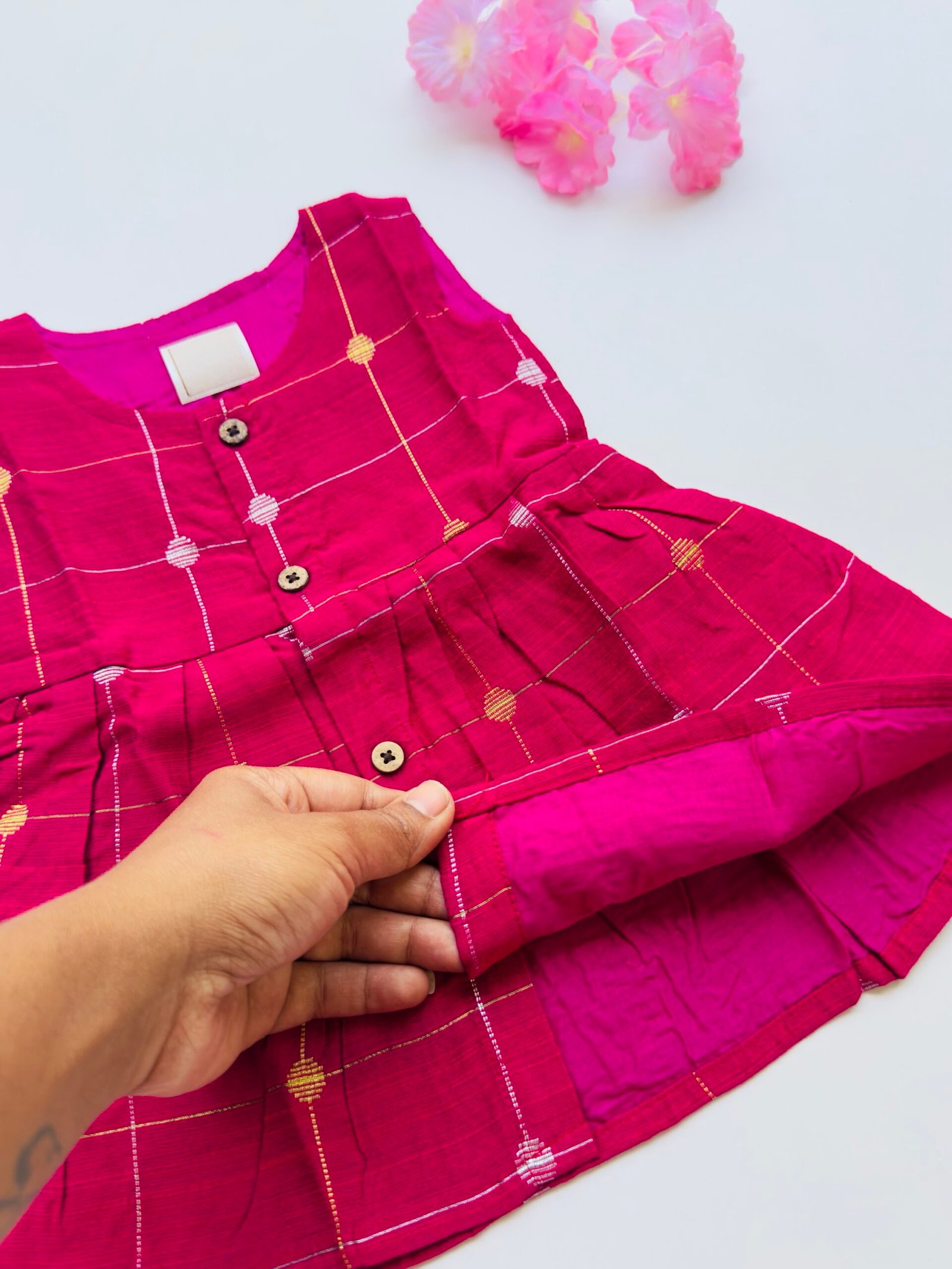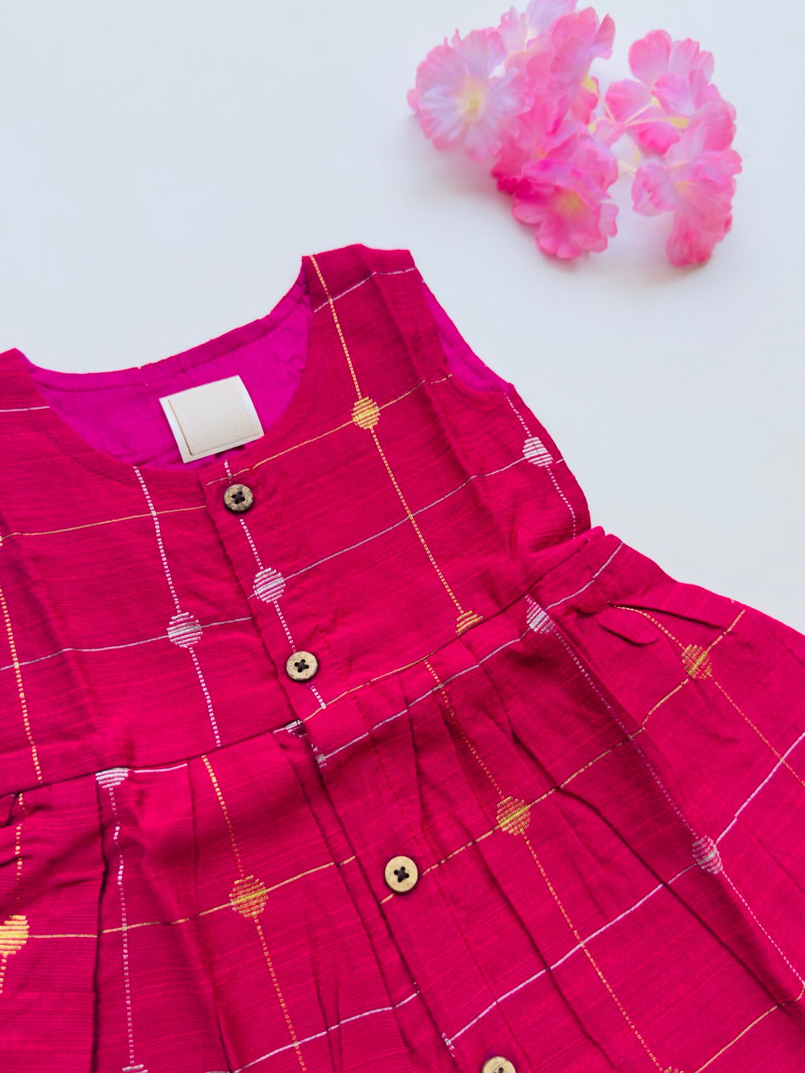 Pink Ethnic Butta Sleeveless Silk Baby Frock With Wooden Buttons