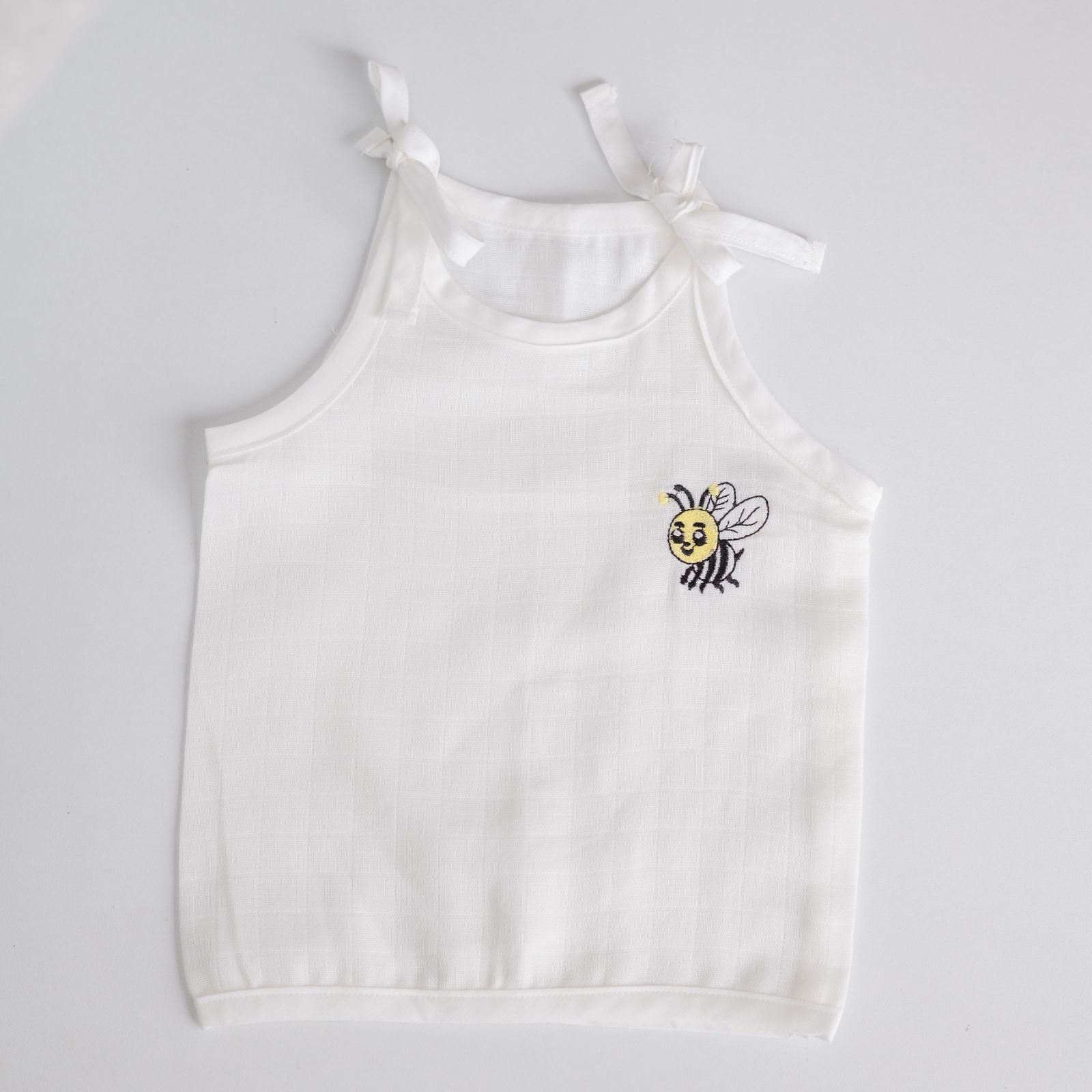 Adorably soft white muslin jabla with front knot closure, featuring delicate honey bee embroidery. Made from 100% breathable cotton, it’s perfect for keeping your newborn cool, comfy, and stylish.