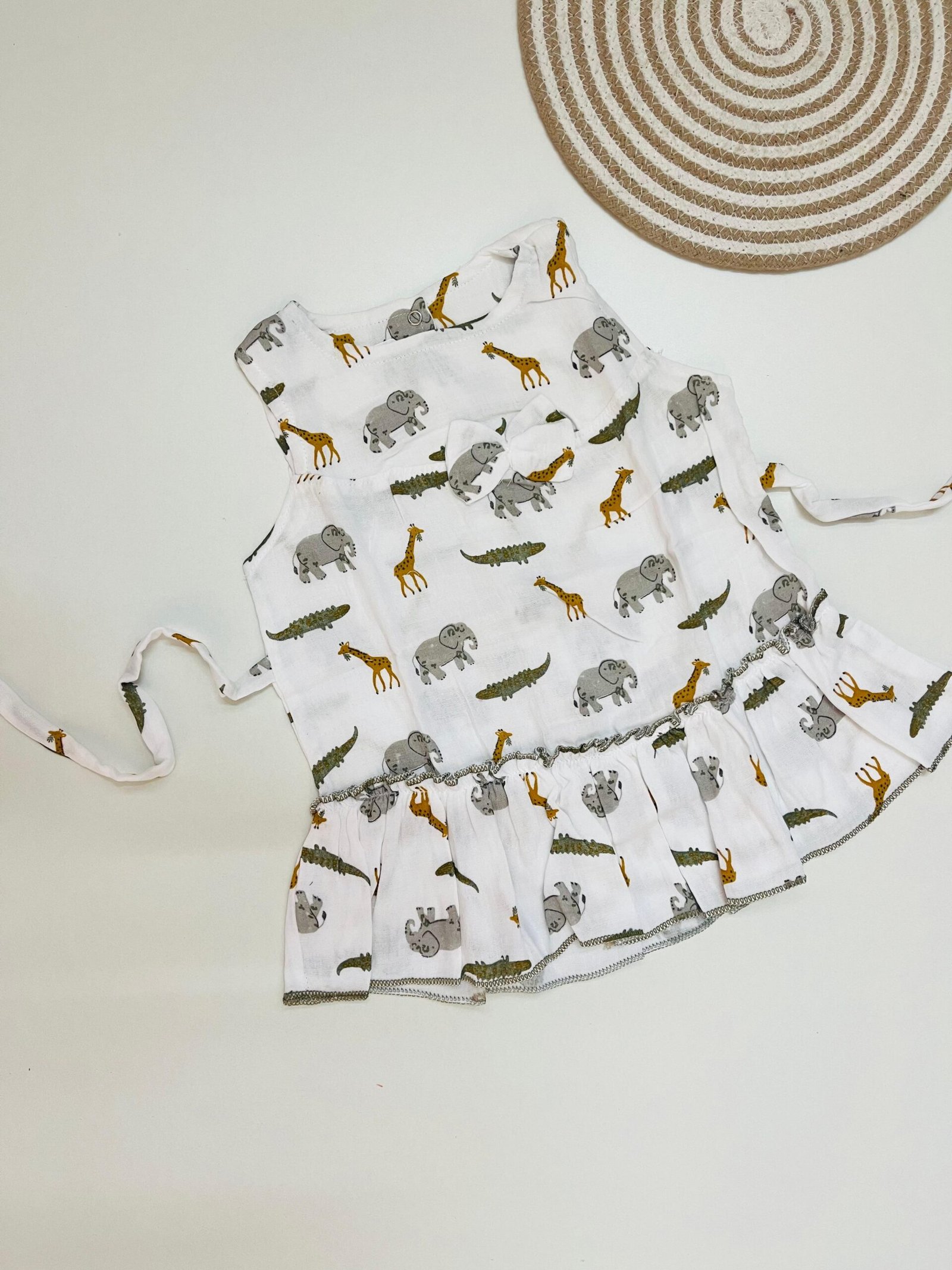 Make your little one’s outfit extra special with this White Safari Animal Print Muslin Frill Top. Crafted from premium muslin cotton, this sleeveless top showcases charming safari animals like elephants, giraffes, and crocodiles — perfect for adding a fun, adventurous touch to your baby’s wardrobe. The front bow detail, side tie-ups, and frilled hemline make it both stylish and comfortable. Lightweight, breathable, and gentle on baby’s skin, it’s ideal for daily wear, playdates, and summer outings.